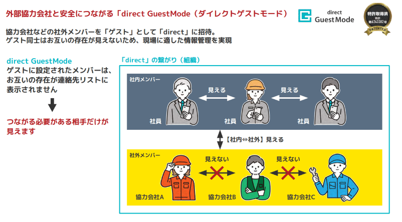 同社の普及を後押ししているのが、特許技術である「ゲストモード(特許第6243382号)」だ 。建設業界は、ゼネコン(元請け)の下に多数の専門工事会社(下請け)が連なる重層下請構造である 。一般的なチャットツールではグループ内の全アカウントが見えてしまうため、元請けにとっては関係のない下請け同士が直接繋がる懸念があった 。ゲストモードを活用することで、ゲスト同士はお互いの連絡先が見えず、必要な相手とだけ安全にコミュニケーションが取れる環境を実現しているのである 。