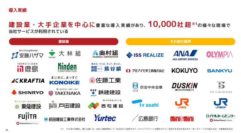 建設業界で培われた高いユーザビリティとセキュリティ機能は、他業界の「現場」でも高く評価されている 。JR東海(東海道新幹線全駅での情報連携)やANA、物流、小売業等への導入が拡大しており、日本国内に約4,000万人存在すると推計されるノンデスクワーカー市場において、広大な開拓余地を有しているのである 。