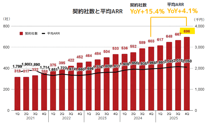 112.8%という高いNRR(売上継続率)が示す通り、チャットツールを起点としたクロスセルが機能し、既存顧客からの収益が自然成長するモデルが確立されている 。 -
