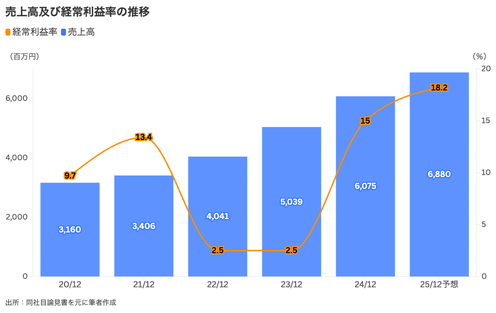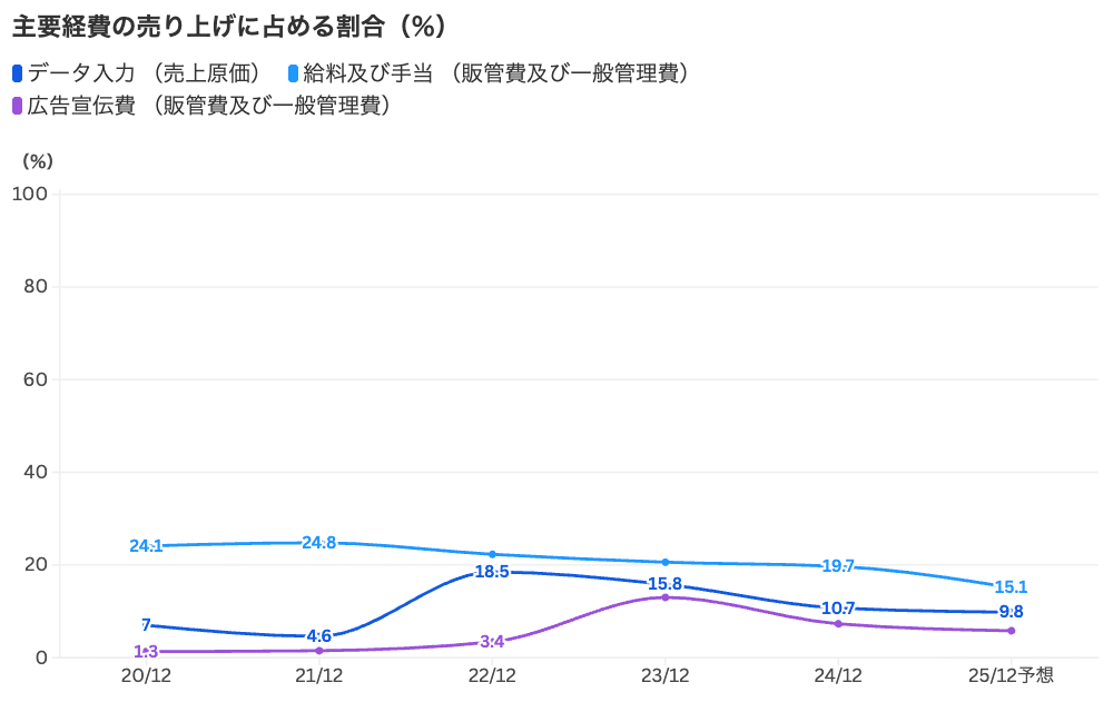 下図は、2020〜2025年における主要コストの売上に占める割合の推移を示したものとなる。22/12期をピークに、全体的なコスト比率は低下の傾向にある。