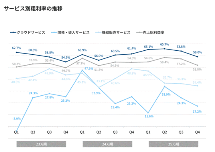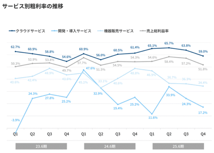 詳細な損益計算書の分析において注目すべき点は、クラウドサービスの売上総利益率が第4四半期に59.0%となり、人材採用への投資によって低下している点である。