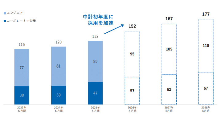 2028年6月期に従業員数を177名(25年6月期比で45名増)まで拡大し、導入・支援体制を先行して整える 。