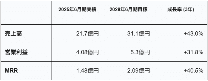 ロジザードは、中期経営計画の最終年度である2028年6月期に、売上高31.1億円、営業利益5.3億円、MRR 2.09億円を目指している。