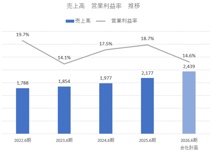 2026年6月期は中期経営計画の初年度として成長投資を行うため、利益率は一時的に低下する見通しである(詳しくは後述)。