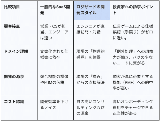 投資家は通常、SaaS企業に対して「高い粗利率」「低い限界費用」「爆発的なスケーラビリティ」を期待する。ロジザードはクラウドWMSを提供しており、ビジネスモデル上はSaaSに分類されるが、その収益構造や成長プロセスには、コンサルティングやシステムインテグレーション(SI)に近い「実務に深く踏み込む地道さ」が含まれている。例えば、エンジニアが顧客倉庫へ出向いて導入支援を行うプロセス は、純粋なSaaS投資家からは「オンボーディングコストが高く、拡張スピードを阻害する要因」と見なされがちである。