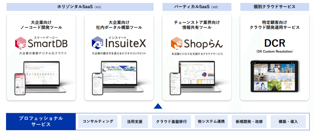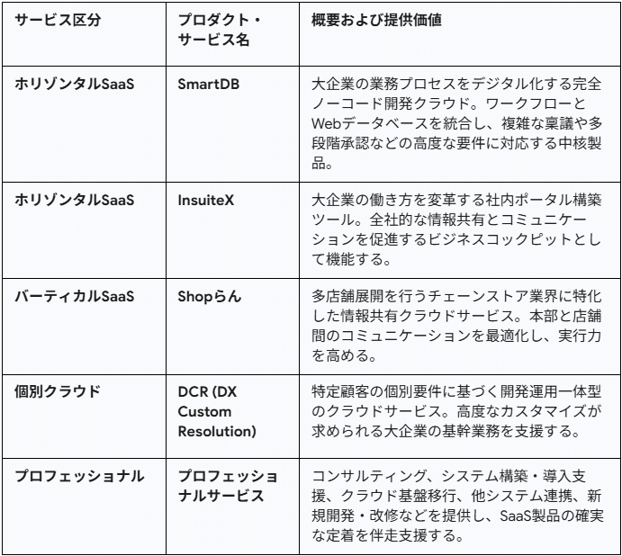 同社の事業内容は、プログラミングの専門知識を持たない非IT人材(現場部門の担当者)でも直感的な操作で業務アプリケーションを開発できるノーコード開発ツールを中心とした複数のSaaSプロダクト群と、特定顧客向けのクラウド・プロフェッショナルサービスから構成されている。提供する主要プロダクトおよびサービスラインナップは以下の通りである。