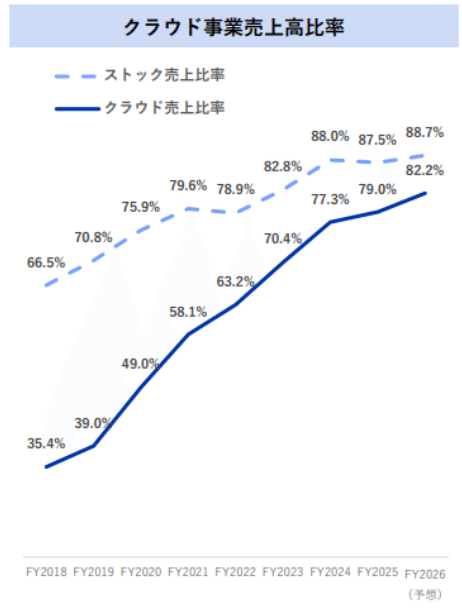 以下のグラフは、同社の売上構成におけるストック比率およびクラウド比率の劇的な進化を示している。