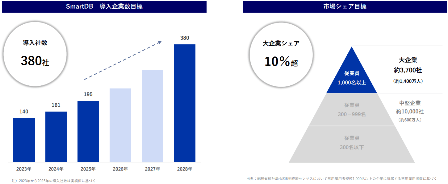 ドリーム・アーツは、圧倒的なポテンシャルを持つエンタープライズ市場を確実に取り込むため、2026年12月期から2028年12月期を対象とする野心的な中期経営計画を推進している。同社は、大企業における業務システム開発の主流がSIerによる受託開発からノーコード開発(市民開発)へとシフトすることを見据え、2028年12月期末までに従業員1,000名以上の大企業におけるSmartDBの導入シェアを10%超(導入企業数目標380社)へと飛躍的に引き上げることを至上命題として掲げている。(なお、2025年実績の導入社数は195社である)。
