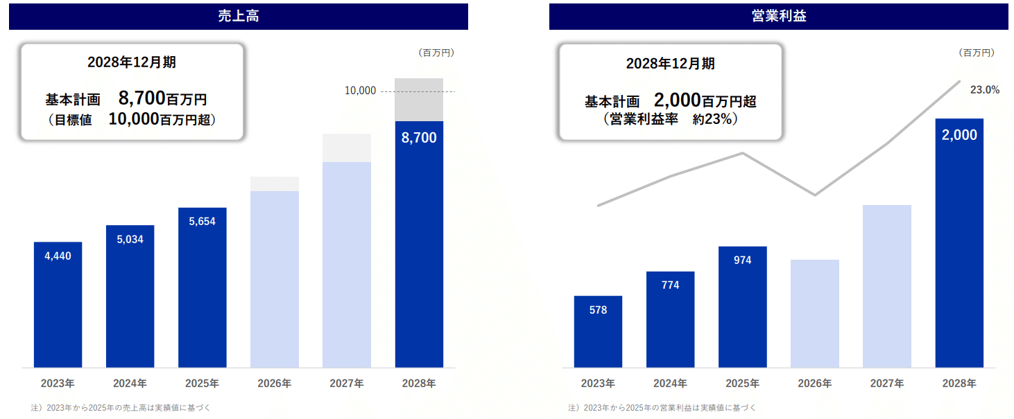 この目標を達成するための財務的マイルストーンとして、2028年12月期においてオーガニックな成長のみで売上高8,700百万円(目標値としては10,000百万円超)、営業利益2,000百万円超(営業利益率約23%)という力強いトップライン成長と高収益化の実現を目指している。