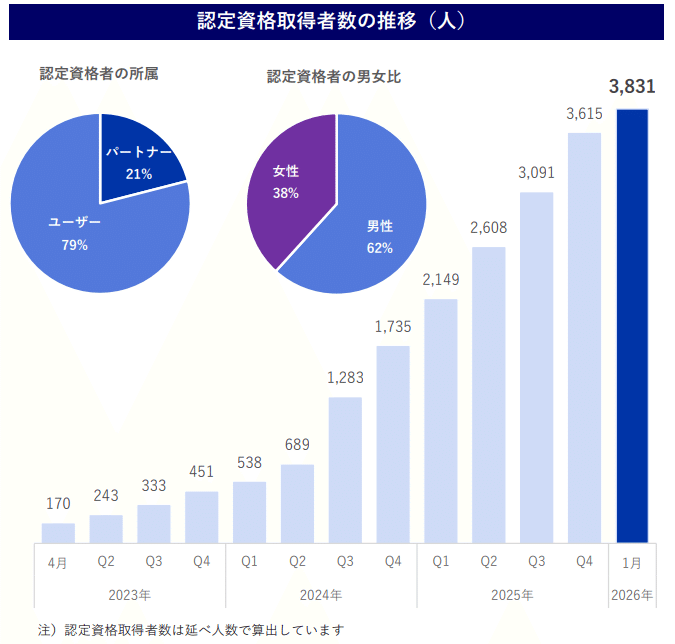 2025年末時点でこの認定資格取得者は延べ3,831名(前年同期比で大幅増)を突破しており、KDDIなどの先進的な大企業では、社内におけるデジタル人材育成戦略や人事評価制度の指標の一環としてSCSが公式に活用されている。資格保有者の79%がユーザー企業の社員、21%がパートナー企業であり、男女比も男性62%・女性38%と幅広い属性に浸透している。 システムの使い方を知る「アンバサダー(伝道師)」が顧客企業の内部で自律的に増殖していくこの構造は、①導入後の活用拡大(アップセル)②解約防止(チャーン低下)を極めて低コストで実現する究極の成長エンジンである。同時に、コンサルティング企業やSIer(アクセンチュア等)との戦略的パートナーシップの拡充も進行しており、自社営業人員の増加に依存しないスケーラブルな販売・導入体制が確立されつつある。
