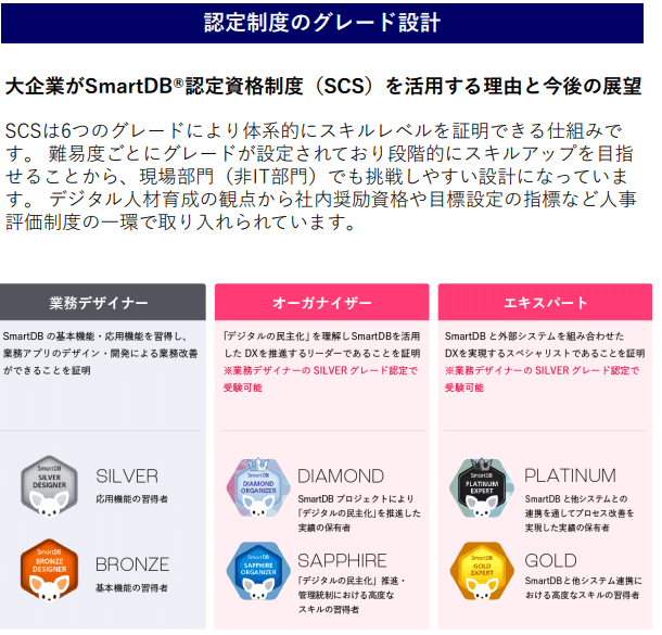 この中で特に注目すべきは、5つ目のCSFである「EC2」における「SmartDB認定資格制度(SCS:SmartDB Certified Specialist)」の爆発的な普及である。SCSは、基本機能を習得する「業務デザイナー」、DX推進リーダーとしての「オーガナイザー」、高度なシステム連携を担う「エキスパート」という段階的なグレード設計がなされており、非IT人材でもスキルレベルを客観的に証明できる仕組みとなっている。