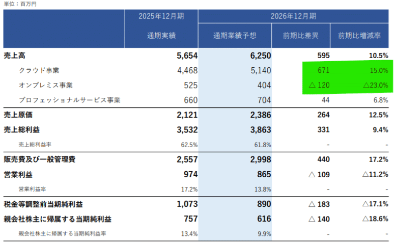 2026年12月期の業績見通しは、主力クラウド事業で前年比15.0%の増収を見込む一方、レガシーなオンプレミス事業の意図的な縮小と、人材獲得、広告販促、AI開発へのアグレッシブな先行投資により、一時的な減益計画となっている。この減益は競争力低下によるものではなく、NRR(売上継続率)109.8%という極めて健全なユニットエコノミクスを背景に、中長期的な市場シェアとLTV(顧客生涯価値)を極大化するための極めて合理的かつ野心的な布石として評価されるべきである。
