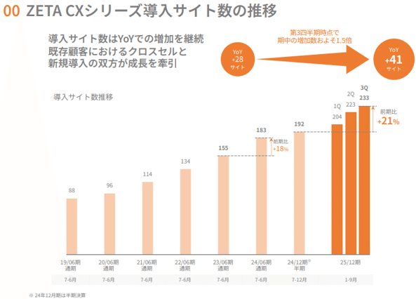 ZETA CXシリーズ全体の導入サイト数は前年同期比で二桁成長を続け、期中純増が前年の+28サイトから+41サイトに約1.5倍と拡大している。SEARCH・RECOMMEND・VOICE・HASHTAGなど複数製品を組み合わせた採用が増加しており、1社あたり取引額の増加と解約率低下につながるストック基盤を強化している。