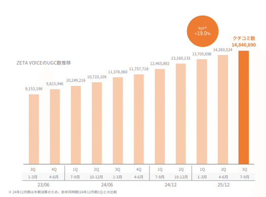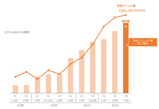 リテールメディア広告エンジンの ZETA AD は案件数が増加し「成長期」に入ったと位置づけられ、クライアントにとっては新たな収益源、同社にとっては成果連動型の売上機会として育成が進んでいる。生成AI検索最適化サービス ZETA GEO は、SEARCH・VOICE・HASHTAGなどで蓄積したデータを活用し、FAQやLP(ランディングページ)をAIに学習されやすい形で自動生成することで、生成AI経由の流入最適化を狙う新サービスである。現時点で売上規模は限定的だが、SEARCHによる安定収益、HASHTAG/VOICEによる成長、AD/GEOによるAI・メディア拡張という三層構造が整いつつある点が、第3四半期の特徴といえる。
