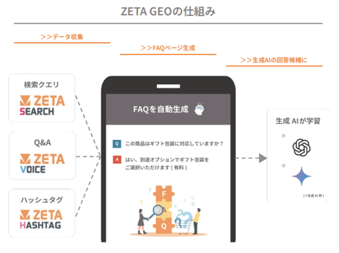 検索行動がAIチャット起点へ移る中、ZETAはSEARCH・VOICE・HASHTAGで蓄積した検索ログとUGCを強みとして、生成AI検索最適化サービス「ZETA GEO」を展開している。Q&A一覧ページやLPをAIに学習されやすい形で自動生成し、「ゼロクリック検索」環境においてECサイトへの流入を維持・拡大する狙いである。