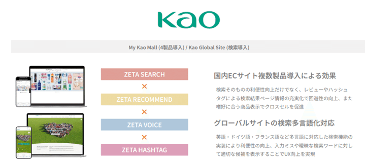 大手消費財メーカーや専門店、総合ECなどBtoC大手が中核顧客である。SEARCH・RECOMMEND・VOICE・HASHTAGなどの複数製品をセット導入する事例が増えており、花王「My Kao Mall」やPLAZAなどが該当する。こうしたスイート型採用(同一プラットフォームの製品に統一して構築する)はARPU向上と長期契約化に寄与する。
