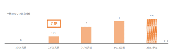 同社は2023年6月期 1.25円から 2025年12月期 4.40円(予想)まで段階的に増配を計画しており、成長投資を優先しつつも、利益成長の成果を着実に株主へ還元するスタンスを示している。第3四半期時点で利益進捗はレンジ下限寄りだが、通期増益見通しを前提にすれば、現行配当は「投資と還元のバランスを取った水準」であろう。