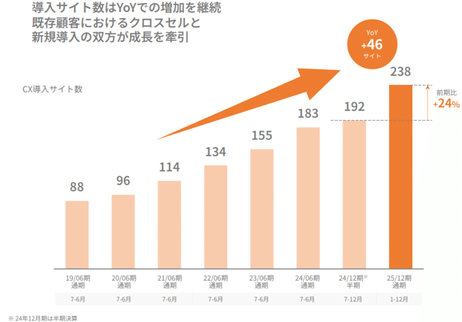 ● 導入実績:期末時点の導入サイト数は238サイトに達し、前期比で+46サイト(+24%)の順調に増加が続いている 。