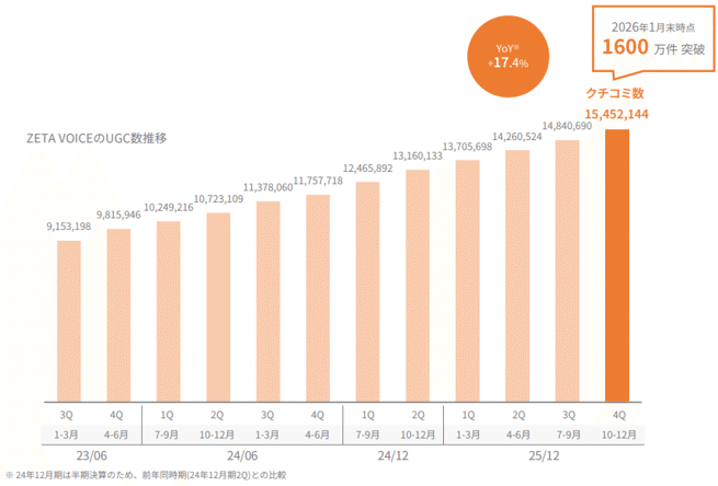 ● VOICEによる膨大なデータ資産:取り扱いUGC(ユーザー生成コンテンツ)数は1,600万件を突破した(2026年1月末時点) 。この膨大なクチコミ・Q&Aデータは、同社が推進するAI・RAG(検索拡張生成)戦略における「学習データ」として、価値の高い戦略的資産となっている 。