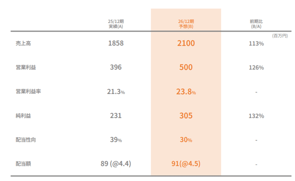 前期(25.12期)からスライドした約2億円の営業利益がそのまま上乗せされるのであれば、利益目標はより高くなるはずだという見方がある。