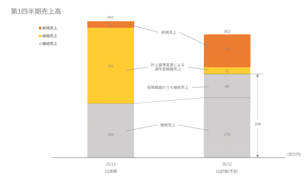 ● 今期1Qの計画:これに対し、2026/12期 1Qの売上計画は362百万円と設定されている 。