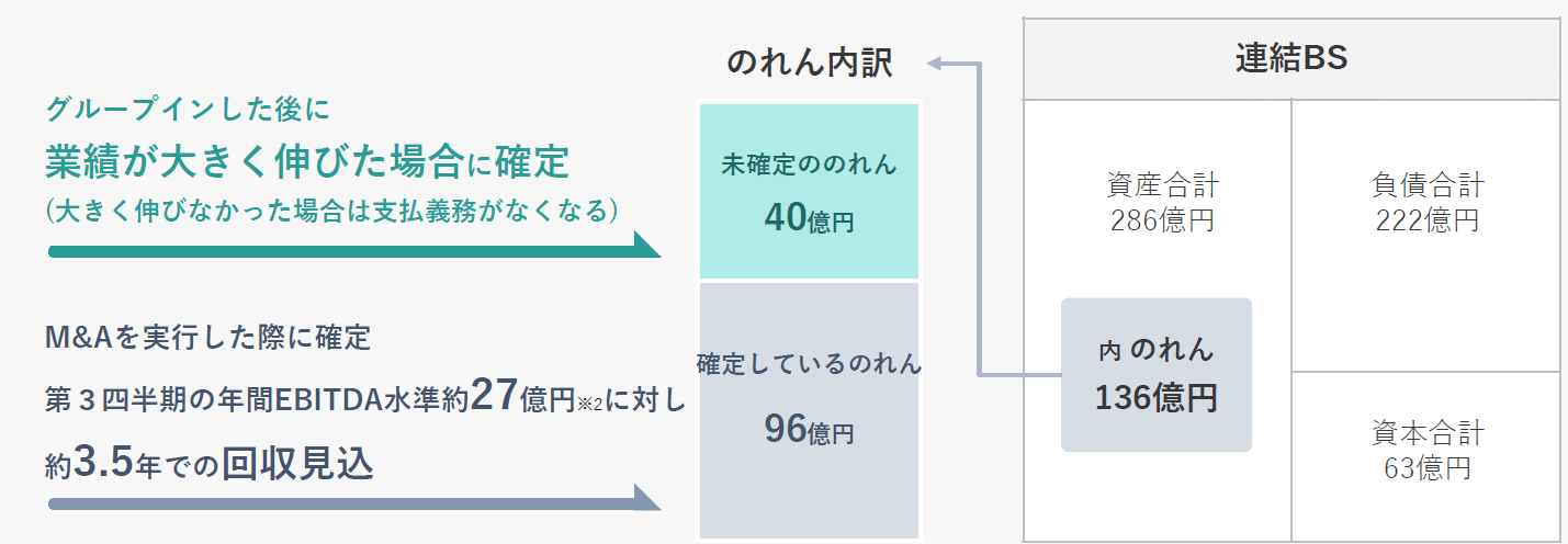 確定しているのれんは全体の約70%であり、直近EBITDA実力値(第3四半期の年間EBITDA)約27億円に対して約3.5年以内で回収可能との説明である。 一方、未確定ののれんは「グループイン後に業績が大きく伸びた場合にのみ確定」し、設定水準に届かなければ支払義務自体が消滅する。この意味で、投資家が懸念しがちな「のれん=必ず将来減損するリスクの塊」というイメージとは性質が異なり、成功時には利益拡大と引き換えに確定し、未達時には支払わずに済むオプション型の構造になっている。