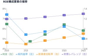 下図は、同社のROE構成要素(純利益率、総資産回転率、財務レバレッジ)の推移を示したものである。