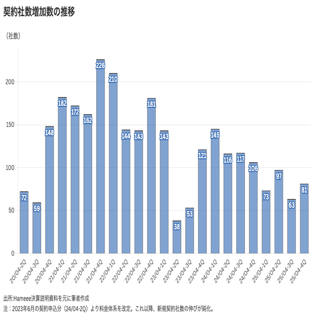 Hameeは2023年6月(24/04期2Q)にネクストエンジン事業の料金体系を改定した。基本料金を月額10,000円から3,000円へ引き下げる一方で、従量課金を引き上げた。その後は、新規契約社数の増加が鈍化する傾向にある(下図)。
