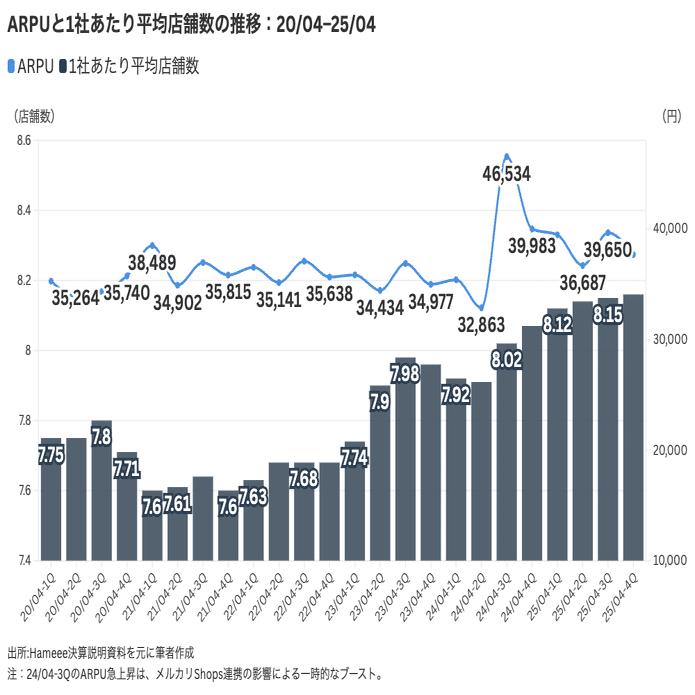 その後のARPUは上昇しており、一見すると有料オプション導入によるアップセルが進んだように見えるが、実際には1社あたり平均店舗数が水面下では進行しており、ARPU上昇の主因は純粋に取扱量の増加による利用単価の自然な上昇であった。有料オプションによる明確な収益寄与は現在のところ見られない(下図)。