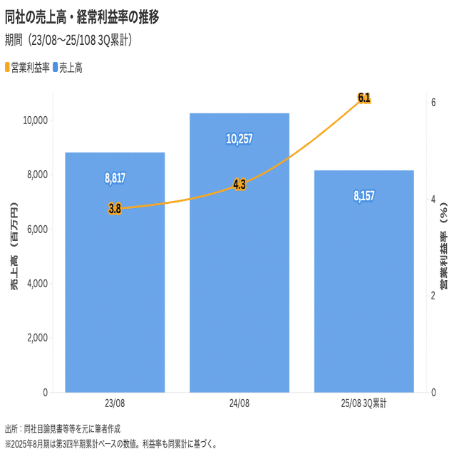 また、同じタイミングで調達した借入金については、返済が進んでおり、2024年8月末時点で5,289百万円の残高が計上されている。会社計画によれば、毎期3〜4億円規模の返済により7〜10年程度で完済可能と見込まれる。